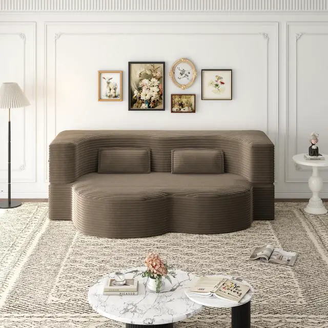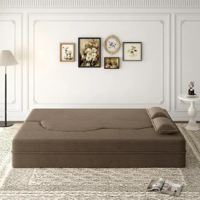 Modern Floor Sofa with 2 Pillows,Convertible Plush Corduroy Foam-Filled Sleeper Sofa Bed,15" Full Size Folding Mattress for Living Room,Guest Bed,no assembly required,Coffee