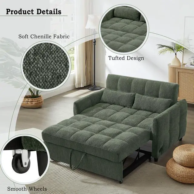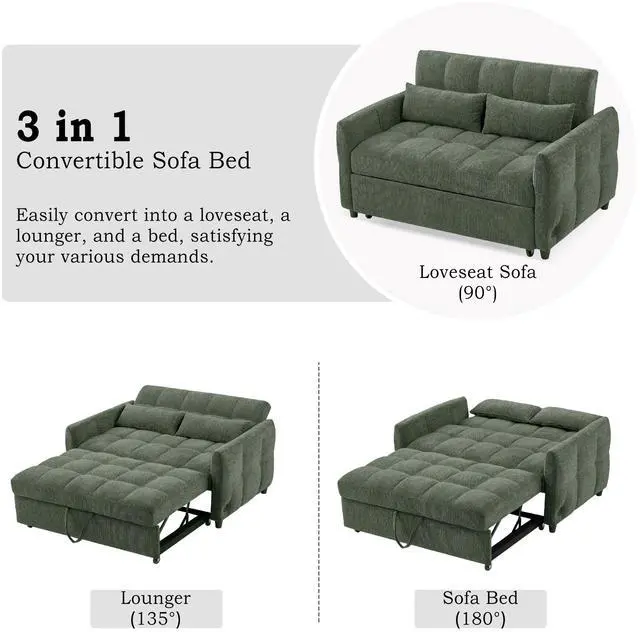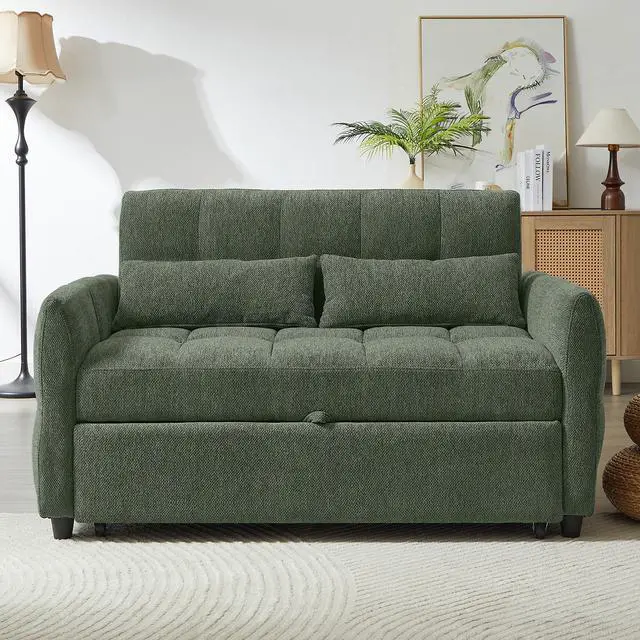 • 52.8" Loveseat Sofa Pull-out Sofa Bed Tufted Sleeper Sofa with an Adjustable Backrest, Three USB Ports and Two Lumbar Pillows for Living Room, Green