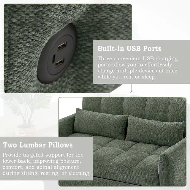 Built-in USB Ports - This sofa bed offers three convenient USB charging ports, allowing you to effortlessly charge multiple devices at once while you rest or sleep. This feature is designed with modern lifestyles in mind, providing a hassle-free, clutter-free charging experience right at your fingertips.