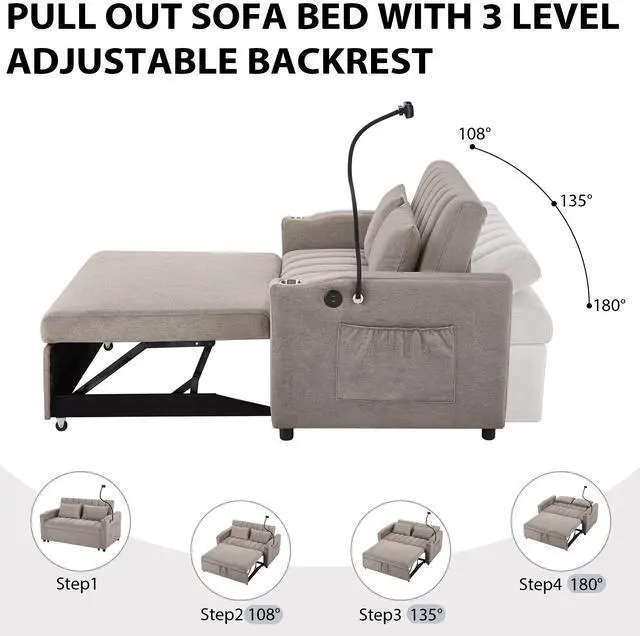 • 55.9" Convertible Sofa Bed Loveseat Sofa with Three USB Ports, Two Side Pockets, Two Cup Holders and 360°Swivel Phone Holder for Living Room, Light Grey