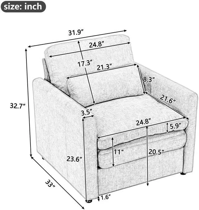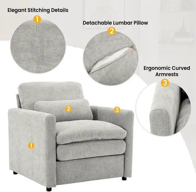 Ergonomic Curved Armrests & Detachable Lumbar Pillow Designed with gently curved armrests, this armchair promotes a natural resting posture for arms and shoulders. The included detachable lumbar pillow provides additional lower back support, making it perfect for reading, lounging, or working from home.