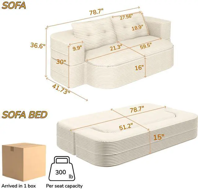 • 78.7" Modern 2-in-1 Foldable Sofa with Functional Blanket and 2 Soft Pillows,Comfortable Plush Corduroy Fabric Sofa, Convertible Sleeper Sofa Bed, Deep Seat Sofa Couch for Living Room, Bedroom