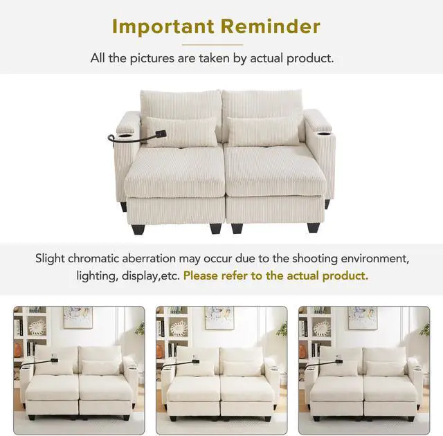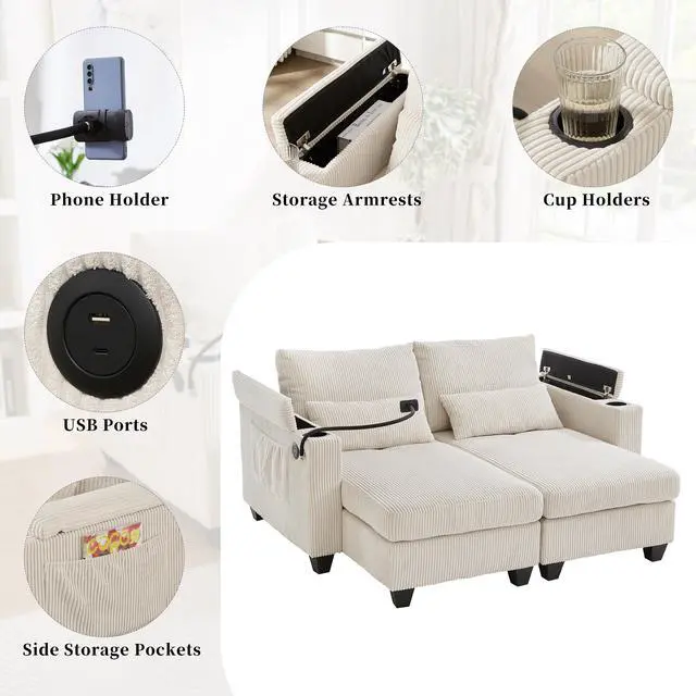 Multi-Functional Armrests Both left and right armrests are thoughtfully designed to serve multiple functions. Each includes a hidden storage compartment, perfect for storing remote controls, chargers, glasses, or snacks. Additionally, integrated cup holders keep beverages secure and within arms reach, making it perfect for movie nights or casual lounging.