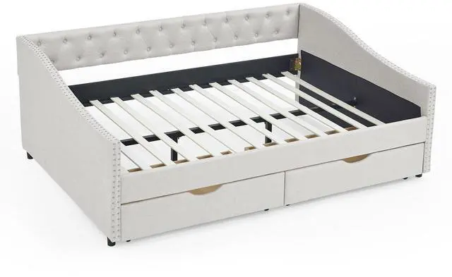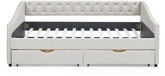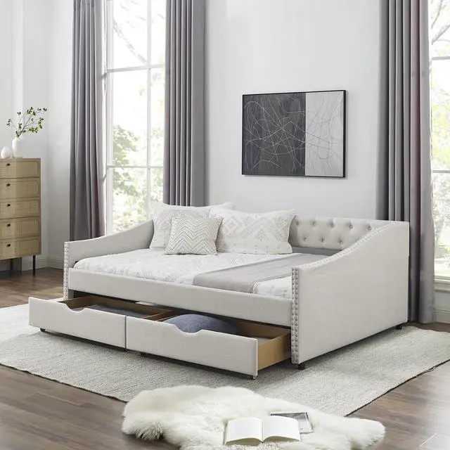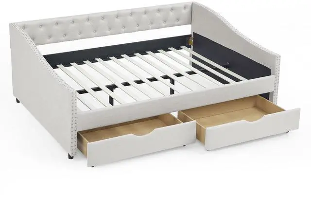 [Functional Trundle] This exceptional piece of living room furniture is manufactured to meet your needs, allowing the cozy bed to not only afford a comfortable seating experience but also two drawers under the bed provide storage function. Reinforced Frame. The frame of this daybed with drawers is crafted from a combination of eucalyptus wood and MDF board to effortlessly hold up to 500lbs.