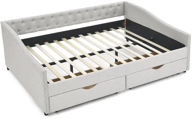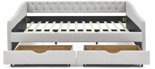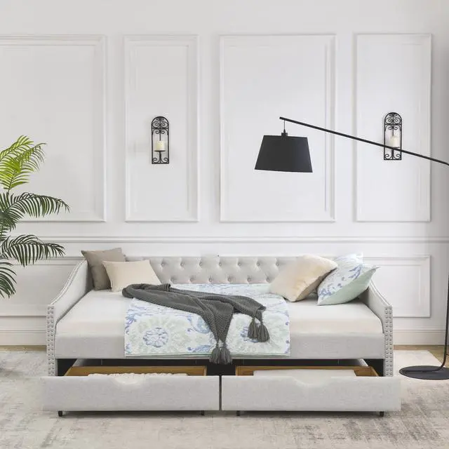 [Functional Trundle] This exceptional piece of living room furniture is manufactured to meet your needs, allowing the cozy bed to not only afford a comfortable seating experience but also two drawers under the bed provide storage function. Reinforced Frame. The frame of this daybed with drawers is crafted from a combination of eucalyptus wood and MDF board to effortlessly hold up to 500lbs.