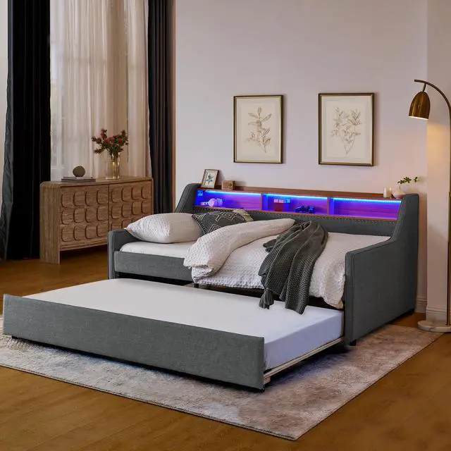 [LED lights design] The 3 color RGB LED lights on the headboard make the sofa bed frame practical and unique. The LED lights on the sofa bed offer 3 static colors and speed and brightness adjustments, providing a personalized lighting atmosphere for your night.