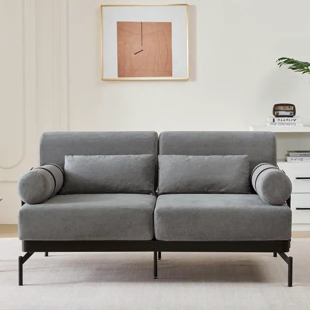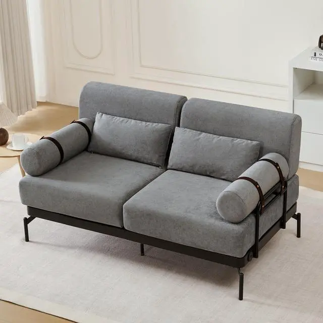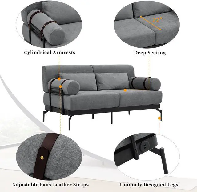 Unique Cylindrical Armrest Design - This loveseat sofa features two uniquely designed cylindrical armrests wrapped with adjustable faux leather straps, offering both aesthetic appeal and practical support. The bold, modern design adds an eye-catching architectural accent, setting it apart from traditional sofas.