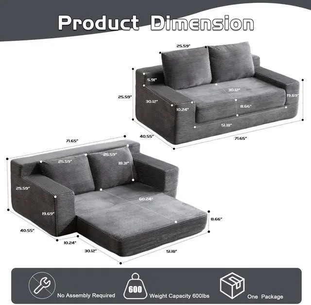 No Assembly Required: The sofa's design eliminates the need for assembly, making it convenient and hassle-free. Upon delivery, you can immediately enjoy the sofa without the time-consuming process of putting it together. This saves you effort and ensures a seamless experience from the moment it arrives. It is important to note that the sofa needs to sit for 72 hours to a week after opening to ensure full rebound.