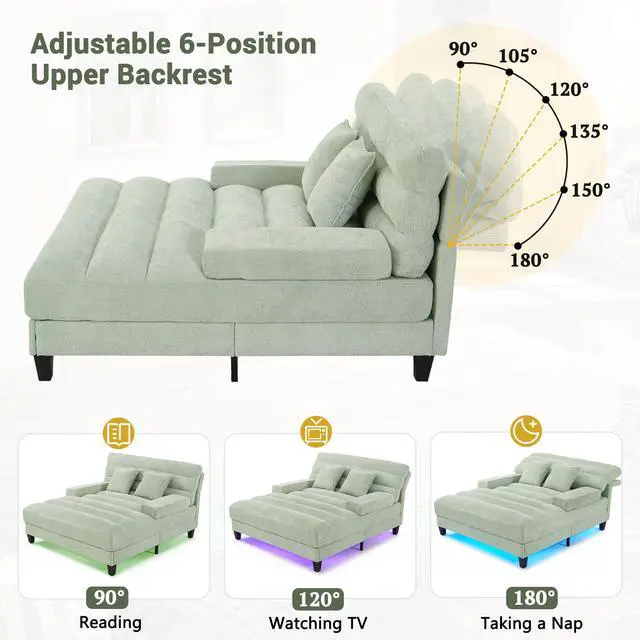 • Modern Chaise Lounge Sofa 57.1" Sofa Bed Chenille Upholstered Lounge Sofa Chair with Adjustable Backrest and LED Light Strip for Living Room, Green