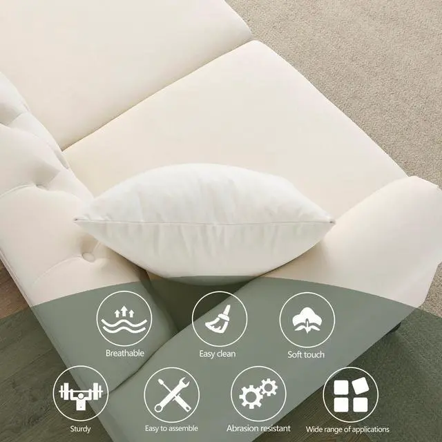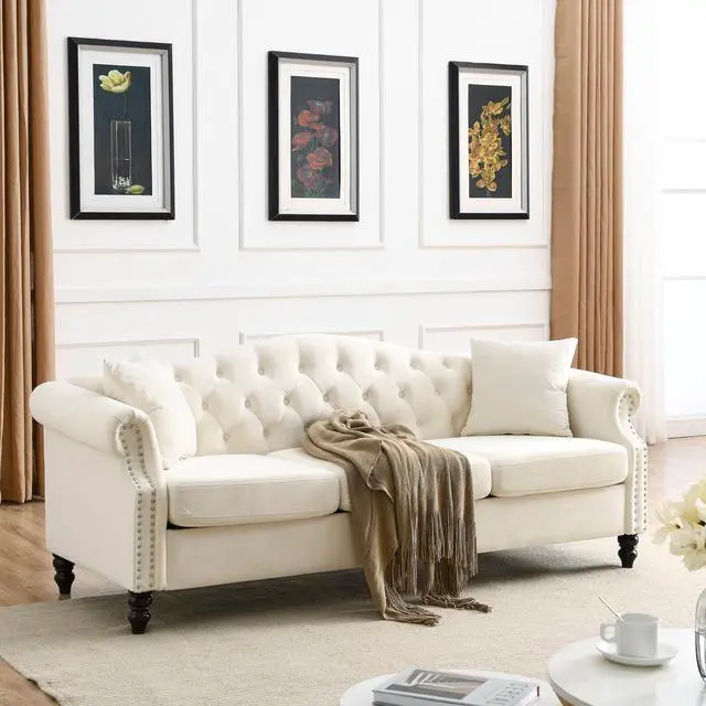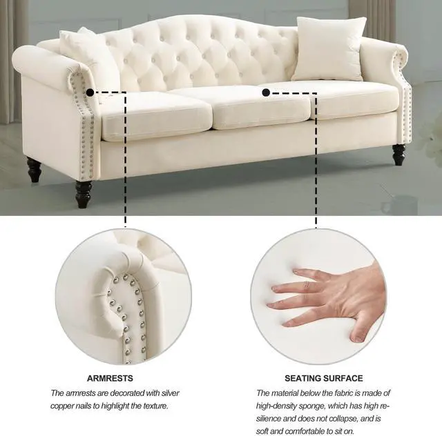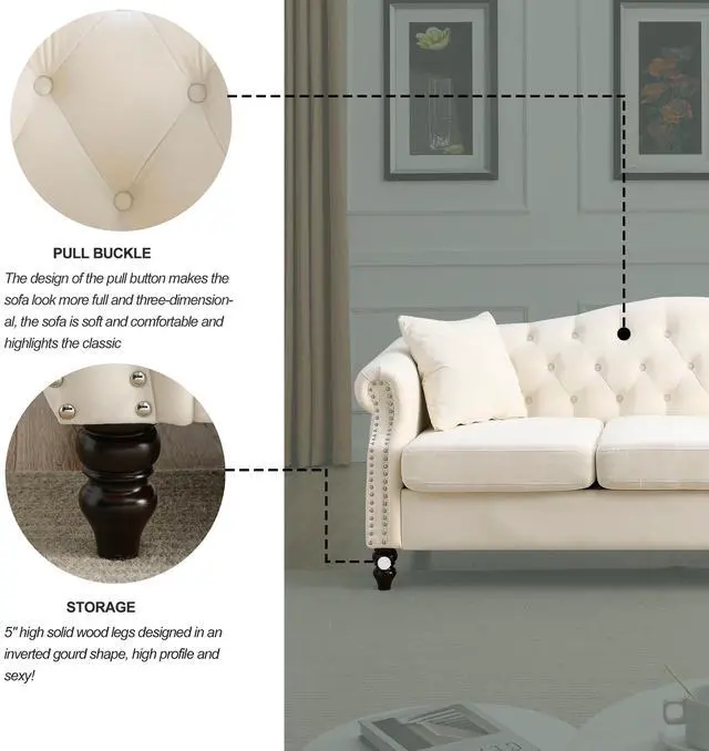 Sturdy and durable. The frame of the sofa is made of solid wood for added sturdiness and durability. With comfortable foam, soft cushions supported by a curved spring structure and tufted buttons on the back and arms, this sofa is perfect for those who want to rest after a busy day.