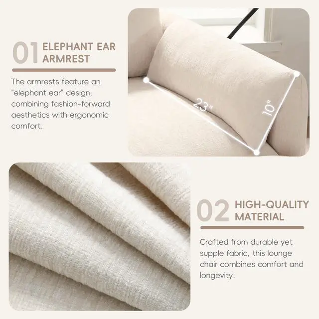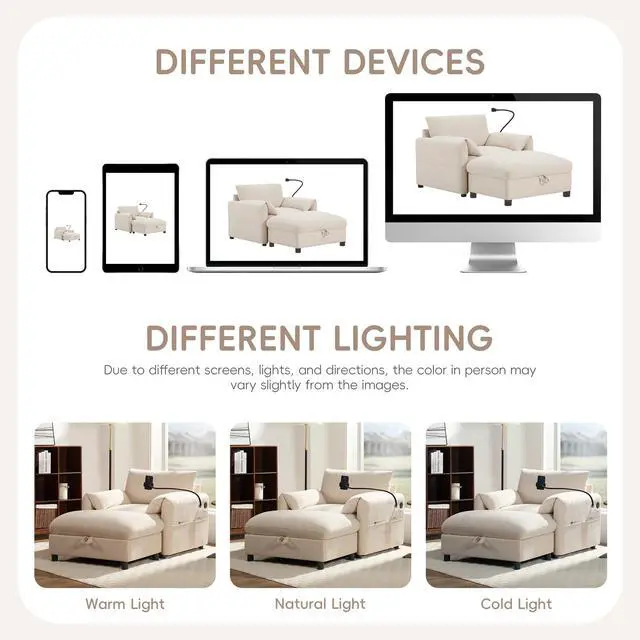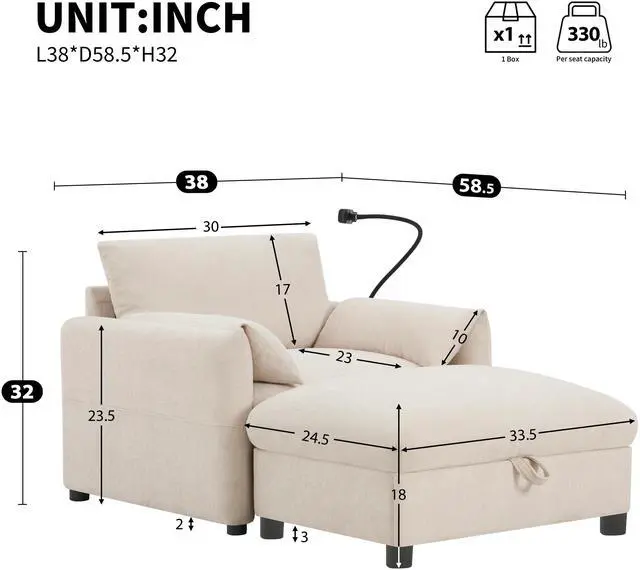 • 38" Single Sofa with Storage Ottoman, Adjustable Phone Holder, USB Charger, Side Storage Pockets, Pillow-Like Armrests, Wide Seat Chaise Lounge for Living Room&Apartment, Chenille, 4 Colors