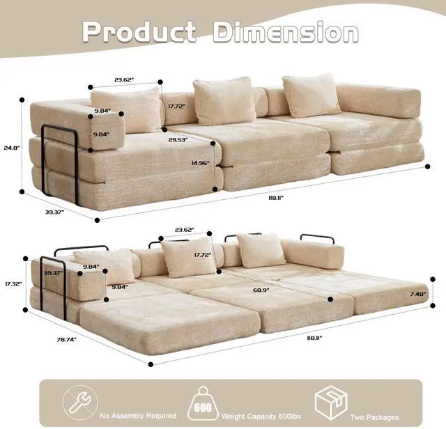 Tips: It takes time for the convertible sofa bed to expand, once you opened it as the cushions are packed in a compressed state; in general cases, it will take approximately 72-96 hours to expand.