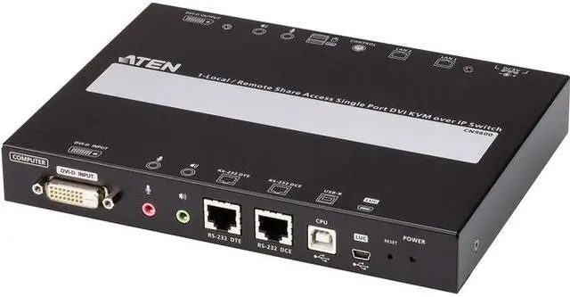 The CN9600 DVI KVM over IP Switch is a cost-efficient over-IP device, which allows remote access of digital video, audio and virtual media via remote control of a PC or workstation. The CN9600 enables over-IP capability by connecting compatible ATEN DVI KVM switch and/or LCD console, such as the CS1768 (8-Port USB DVI/Audio KVM Switch) or the CL3800 (DVI LCD Console). The CN9600 expands on previous models by providing a more compact, slimmer space-saving design for utility optimization, and a FPGA graphics processor that offers better image and video quality to enhance user experience, while also meeting the RS-232 DTE/DCE standards for serial control.