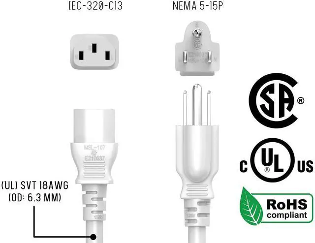 This standard power cord is designed to work with most PC, Monitors, Scanners, Printers, TV, and other devices that use the 3-pin shroud power connector. Cable features an AC style plug (NEMA 5-15P) on one end and a computer style receptacle (IEC-320-C13) on the other end. The female connector plugs directly into the device while the male connector plugs into a standard outlet.