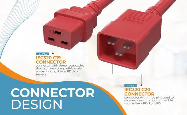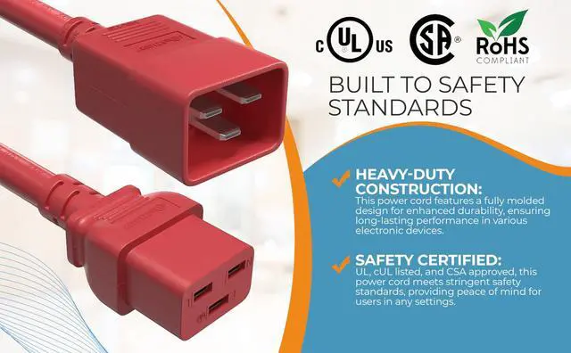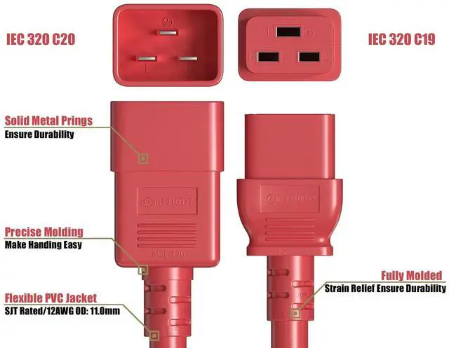 12 AWG 20A 250V Heavy Duty Power Cord (IEC320 C20 to IEC320 C19) These power cords are typically used for PDUs, servers, and UPSs. The male end connects to any IEC320 C19 outlet, while the female end connects to any device or appliance that has an IEC320 C20 inlet. This cable could also be used as an extension cable since it extends the length for your equipment or devices from the power source. This series of power cords is available in varied lengths. Having the right length power cord is essential to having an organized and optimized data center. Our power cord features a fully molded design for maximum durability and long life.