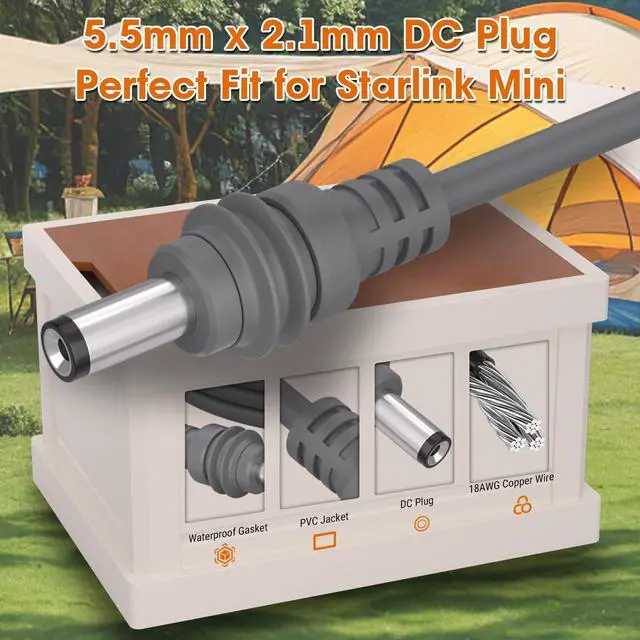 Tailored for Starlink Mini: Specifically designed for the Starlink Mini system, the Starlink Mini DC power cable serves as an ideal replacement or extension, ensuring seamless compatibility and reliable performance right out of the box Easy Plug and Play Installation: With a true plug-and-play design, the Starlink Mini power cable connects effortlessly to your dish and power source. No tools, apps, or adjustments requiredjust plug in and go Stable Power with 18AWG Copper Wire: The Starlink Mini DC power cable features high-grade 18AWG tinned copper wiring that ensures low resistance, minimal voltage drop, and consistent performance over long distanceseven over 3 meters IP67 Waterproof and Weather-Resistant: Built with an IP67 waterproof connector, the Starlink Mini power supply cable is ready for outdoor use in rain, dust, or high-heat environments. Sealed 5521 DC plugs offer both waterproofing and dust protection Durable and Long-Lasting: Constructed for durability, the Starlink Mini cable includes reinforced connectors and heat-resistant materials. Designed to handle repeated bending and outdoor use, the Starlink Mini Accessories offers reliable power transmission wherever you go