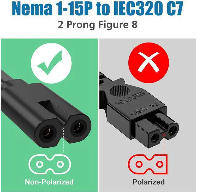 [Parameters] 18AWG pure copper, rated power: 1100W (110V/10A or 250V/4.5A). Non-Polarized 2 prongs figure 8 shotgun connector to NEMA 1-15P.