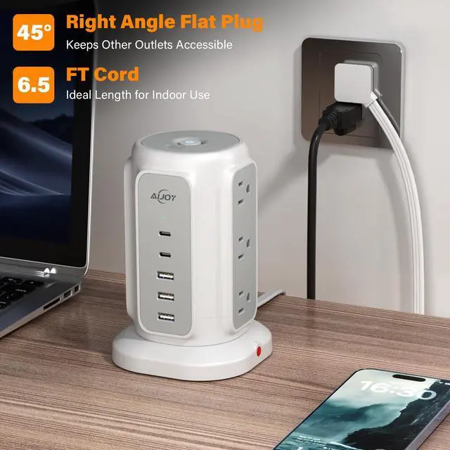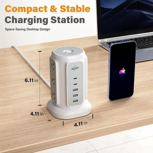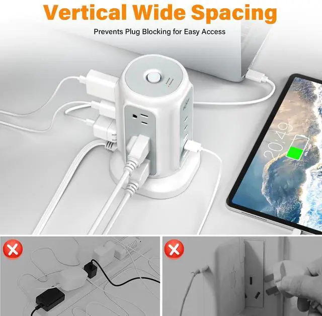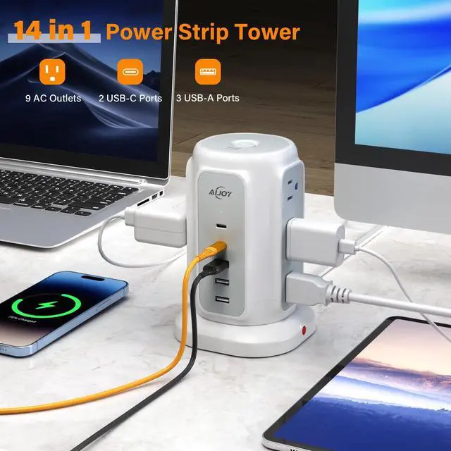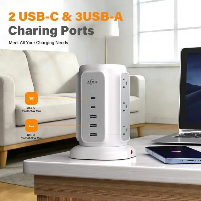 - This tower power strip with 2 types of USB ports (2 USB-C&3 USB-A) gives you more charging options, ideal for charging your phone, laptop, tablet, camera, etc