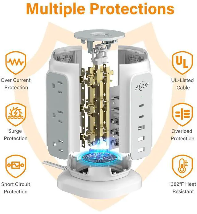 Small surge power strip tower has 1 buttons control, easy to connect or disconnect other cords.