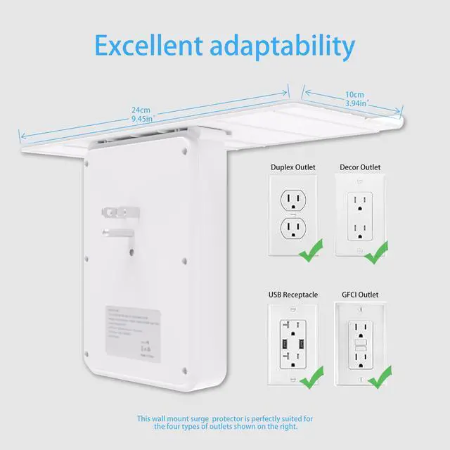This wall surge protector is built-in 900 Joules surge protection,protects electronics from over-load,over-current,over-heat,lightning strike and fluctuations and protect your devices.