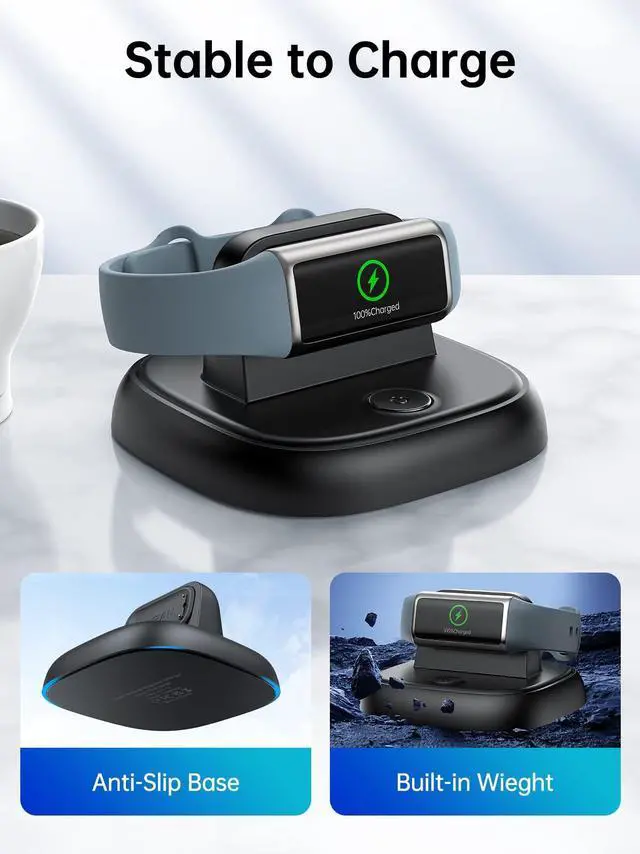 Stable Charging Our fitbit charger stand built-in enough weight which can keep the stand balanced even on a sloping tabletop. More than that, anti-slip mat under the base provide strong grip that remains the stand stay on the table without movement.