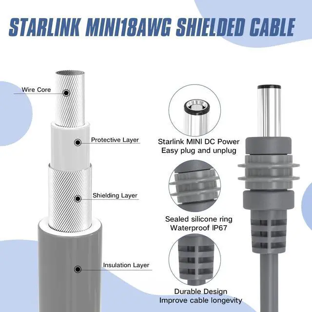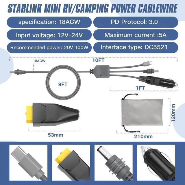 Meet the DECKIT Starlink Mini 3 in 1 Power Cableyour all-in-one solution to power your Starlink Mini satellite antenna anywhere, no more juggling multiple cords for different scenarios! This 10FT cable combines three essential connections in one: USB-C for PD power banks, cigarette lighter compatibility for car use, and a DC cord for standard adaptersperfect for solving on-the-go power headaches. It even includes 5521 female to XT60 male adapters, USB-C to USB adapters, and two 10A fuses, so you can seamlessly pair it with Starlink Mini accessories, whether youre at home, camping, or on an RV trip. Built to last, this Starlink Mini replacement cable uses heavy-duty 18AWG wiring wrapped in a waterproof, wear-resistant silicone coating. It handles extreme temps from -40°C to 140°C and cuts signal delay by 30%tough enough for outdoor adventures, marine trips, or harsh weather that would damage generic cords. Portability is key too: a lightweight goose-down storage bag lets you tuck the cable easily into your gear, making it ideal for hiking, road trips, or any time you need Starlink Mini power on the move. And with 12V-24V plug-and-play operation, theres no complex setupjust connect and go. We stand behind quality: if you have questions about compatibility with your Starlink Mini dish antenna, the XT60 adapter, or anything else, our team is here to help. The DECKIT Starlink Mini 3 in 1 Power Cable isnt just a cordits a reliable power partner for all your Starlink Mini needs.
