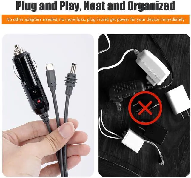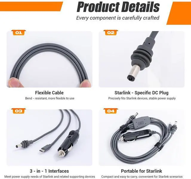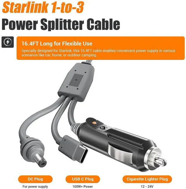 3-IN-1 UNIVERSAL COMPATIBILITY One cable for all your adventures! This all-in-one power solution integrates three essential plugs: a USB-C for PD power banks, a 12-24V Car Cigarette Lighter plug, and a standard DC plug. Effortlessly power for Starlink Mini from your car, RV, home outlet (with a compatible adapter), or portable generator without carrying multiple cables.