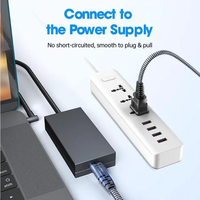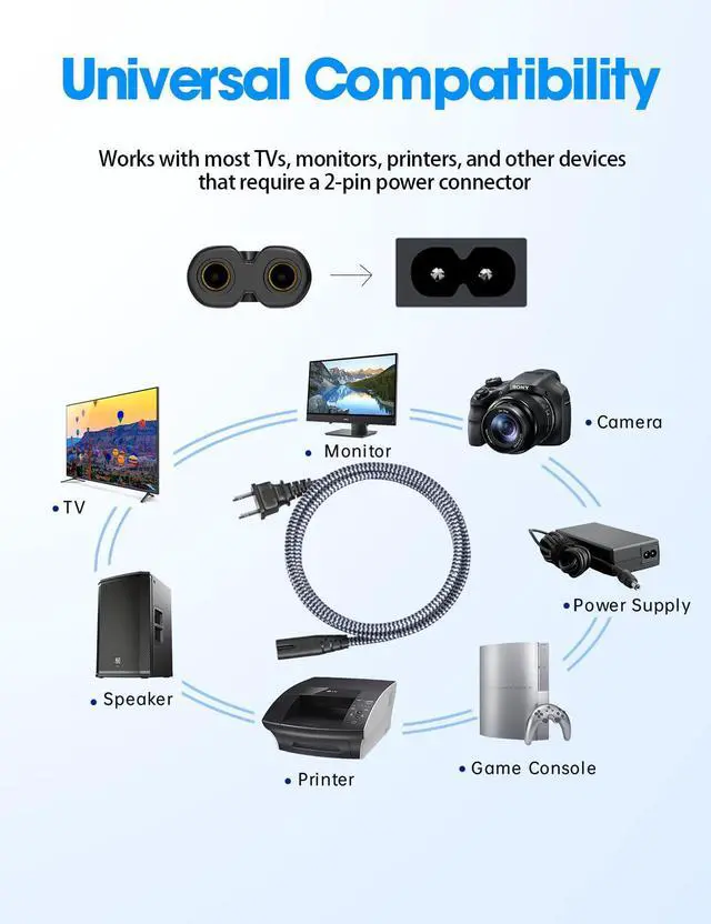 Replacement power cord for 2 slot power jack devices such as laptop power supply, night light, printer. 18AWG 125V, UL Listed. Powerful and reliable, ideal for replacing old or short factory power cable. Great conductivity and performance, heat-resistant and stable.