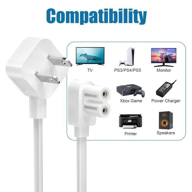[Compatibility #1] Compatible with Philips, Samsung, Toshiba, LG, Sony, Sharp, Panasonic, Vizio, LED, LCD, Smart TV, Monitor, scanner, Canon Pixma/ Epson/ HP printer, projector, PC, computer, powered speakers, Sound Bar, PS5/PS4/PS3 Slim, Xbox One S X and more that have a 2 prong figure 8 shotgun power connector.