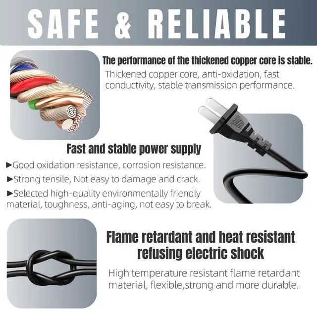 Compatibility: This tv power cord replacement has been tested and validated to ensure it will work with Samsung LG LED LCD Smart 1080p 4K 8K HDTV QLED OLED UHD Crystal Tizen and other TVs and other electronics requiring non polarized 2 prong ac power cord
