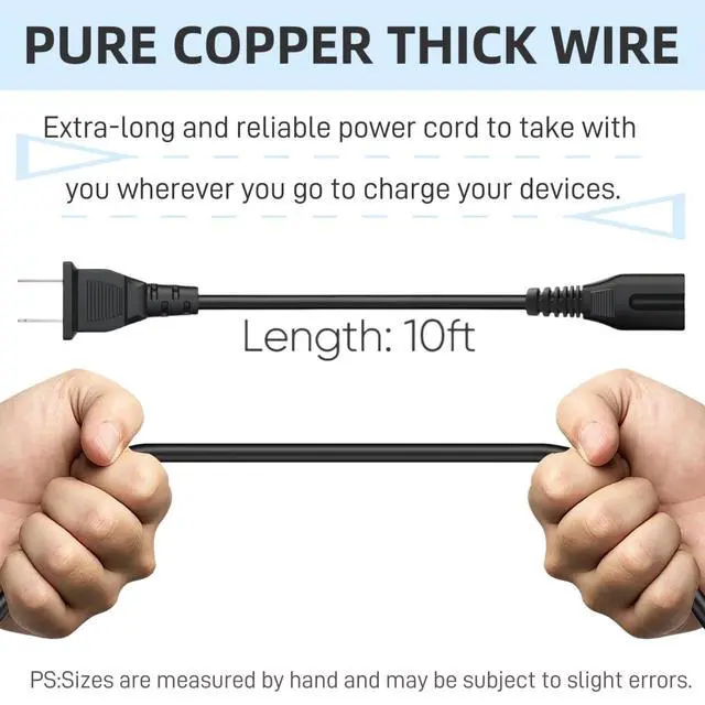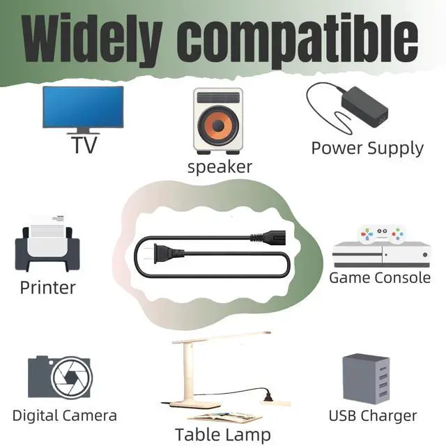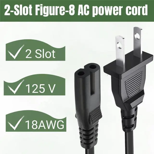 AC Universal Power Cord 2 Prong also Compatible with digital Camera Battery Chargers,TV, Monitor, Projector, Printer, Table Lamp, Power supply, Computer Charger Cable. And other devices with Non-Polarized IEC-60320 C8(Figure 8) socket, 2 Slot Power Cord,18 AWG.