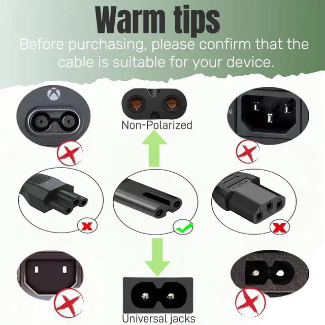 This non polarized power cord are good Compatible with for most Samsung TV, LG, Insignia, Sony, Sharp, Toshiba, JVC, TCL, Hisense, Philips, Panasonic and other series of most LCD smart TVs, PS2, PS3, PS4, PS5, Xbox One S, Xbox One X, Xbox Series S, Xbox Series X, Apple TV 1 2 3 4 5 Gen etc.