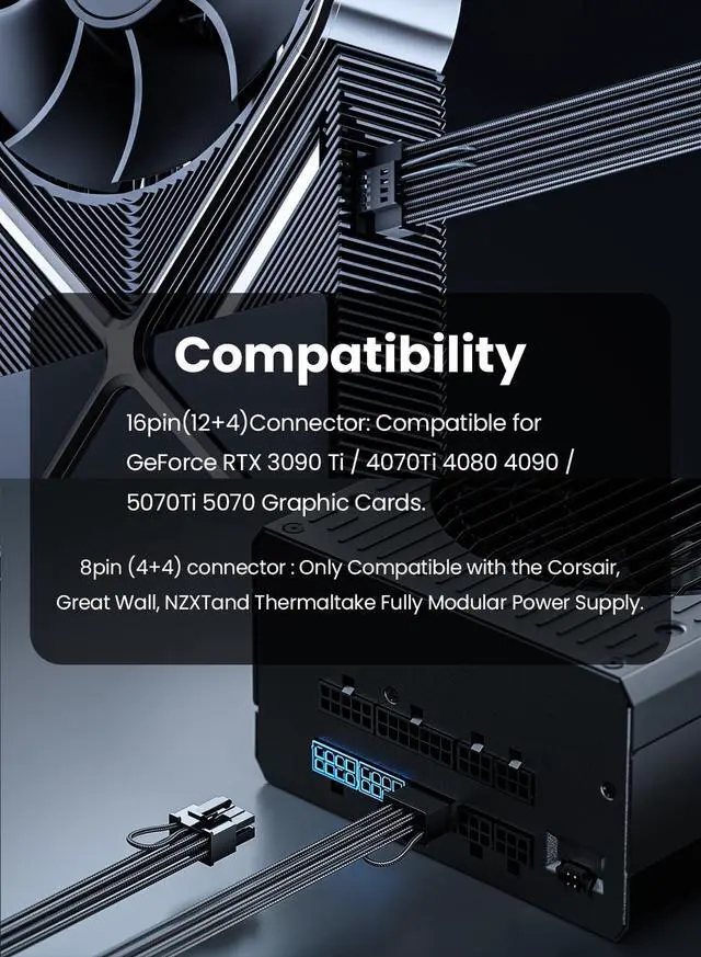 2. This 12vhpwr cable is compatible with the models listed below. This GPU sleeved power cable is NOT compatible with the GPU with 12pin or 8pin power connector, such as GeForce RTX 3090 Series and 8pin RTX 4070 GPU, but compatible with 4070 GPU with 16pin connector.