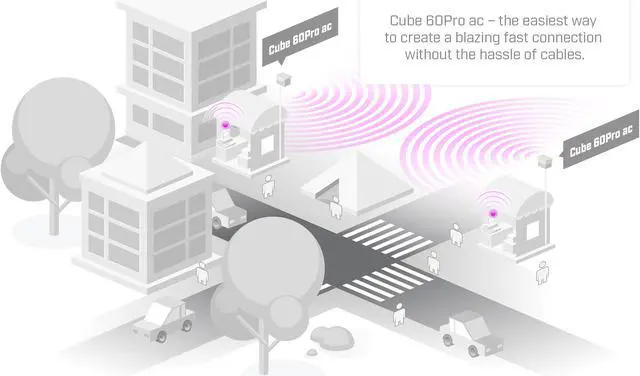 And thats not all we have added Channel 5* support, so you can reach even higher distances if necessary. In our tests, the Cube 60Pro ac easily maintained a reliable connection over 2.4 km. Bridging two locations has never been easier! Forget about downtime with the automatic 5 GHz backup connection The 60 GHz frequency is unaffected by the crowded wireless spectrum, it offers high speed and capacity. But it can sometimes struggle during bad weather conditions. Thats why both Cube 60Pro devices feature an automatic 5 GHz failover. We have added a powerful directional antenna so that the 5 GHz range can keep up with the 60 GHz.