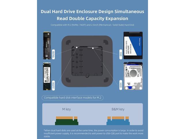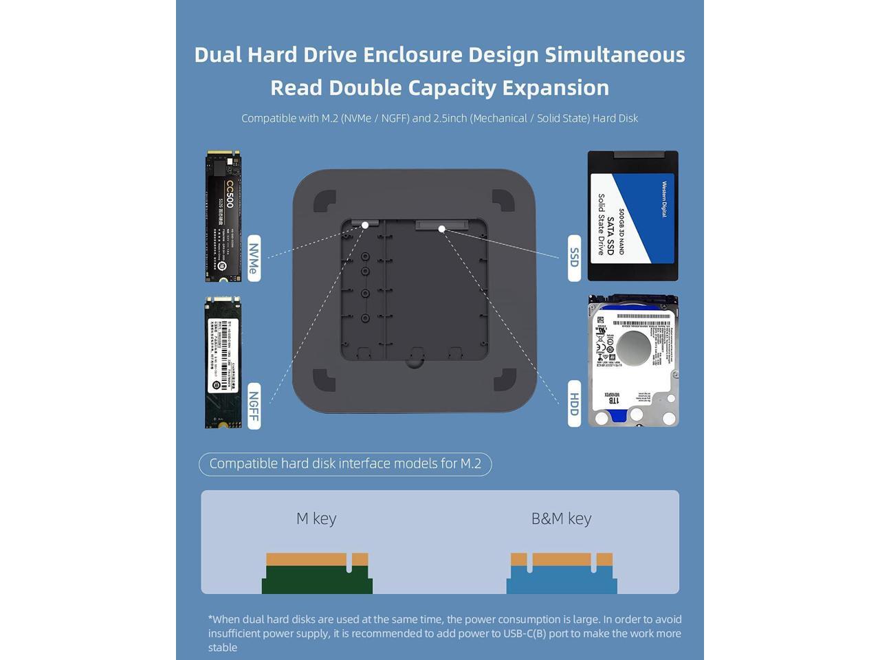 - Dual Hard Drive Enclosure Design: Compatible with M.2 (NVMe / NGFF) and 2.5inch (Mechanical / Solid State) hard disk (Hard disk within 10mm), support dual hard disk read and write at the same time