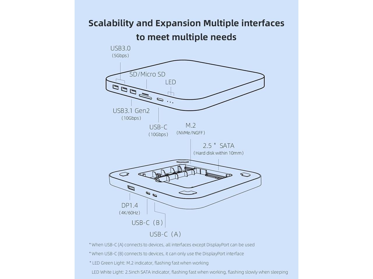 - Multiple interfaces: Hagibis Mac Mini Dock with M.2 NVMe/NGFF, 2.5inch SATA hard drive enclosure, DP1.4, 10Gbps USB3.1 Gen2, 10Gbps USB-C, 2 5Gbps USB3.0, SD/Micro SD card slot. Various interfaces meet all your needs