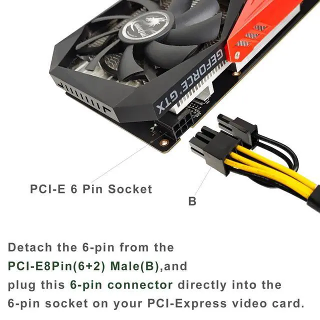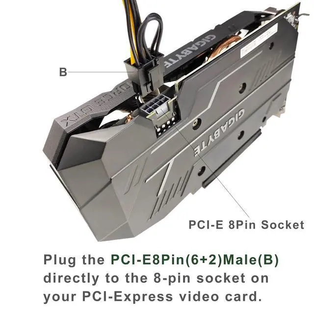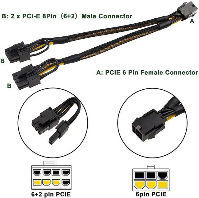 PCIe 6 Pin to Dual 6+2 Pin: Connector A: PCIE 6 Pin Female Connector. Connector B: 2 x PCI-E 8 Pin (6+2) Male Connector.