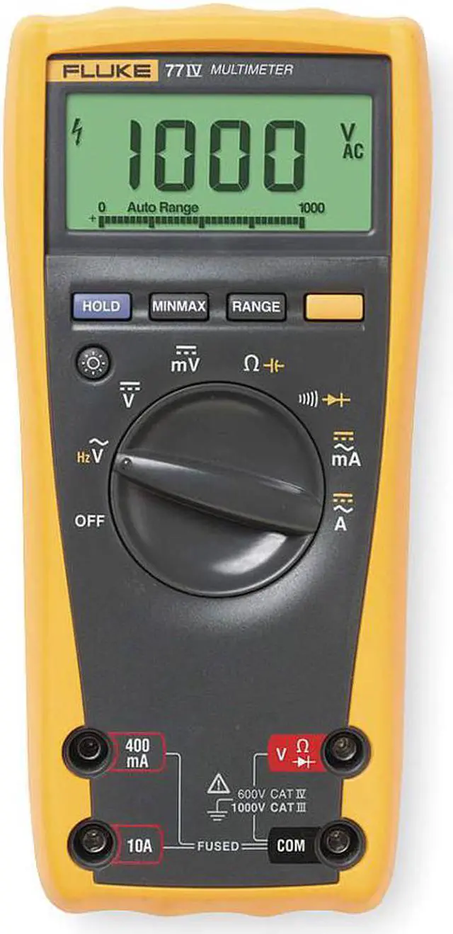 Digital Multimeter, Full Size - General Features, 6000 Instrument Counts, Basic DC Accuracy +/- 0.30 Percent of Reading + 1 Digit, CAT IV 600V, Max. AC Volts 1, 000, Max. DC Volts 1, 000, Max. AC Amps 10, Max. DC Amps 10, Audible Continuity Yes, Max. Ohms 50 megohm, Instrument Frequency Counter Range 0.01 Hz to 100 kHz, Capacitance Range 1 nF to 9999 uF, Display Backlit LCD, Bar Graph Yes, Min. /Max. Memory Yes, Calibration Certificate Included No.