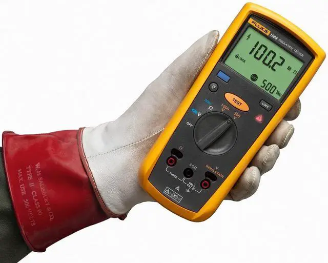 The Fluke high-voltage digital megohmmeter is an insulation tester with preset and adjustable test voltages for measuring insulation resistance to 1T (2T for 10kV models) to indicate the condition of windings or cables in motors, switchgears, electrical installations, and other insulated equipment, and it also measures leakage current to 2 milliamperes (mA), capacitance to 20F, and AC and DC voltage to 600V, signaling when a voltage greater than 30V is detected. In addition to the preset test voltages of 250V, 500V, 1,000V, 2,500V, 5,000V, plus 10,000V for the 10kV models, test voltages can be adjusted in 50V increments to 1,000V and 100V increments above 1,000V. Its PI/DAR (polarization index/dielectric absorption rate) function automatically calculates PI and DAR, which are measurements over time that give a truer indication of insulation condition than single-point measurements. The meter can perform timed tests up to 99 minutes, adjustable in 1-minute increments, and has storage for up to 99 test results. Stored results can be uploaded to a PC with the included FlukeView Forms Basic software. The software is compatible with Microsoft Windows 2000, XP, and Vista. For improved accuracy during high-resistance testing, the guard terminal eliminates interference from leakage current. The meter has an LCD that shows the reading numerically and in a bar graph. Megohmmeters are commonly used for electrical maintenance and testing in industries such as HVAC, transportation, manufacturing, mining, and utilities, among others.