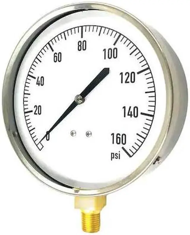 California Proposition 65: This product contains a chemical known to the State of California to cause birth defects or other reproductive harm. Industrial Pressure Gauge, Accuracy +/- 1.0 Percent, Gauge Case Material Stainless Steel, Nominal Dial Size 4 1/2 in, Lens Material Acrylic, IP/NEMA Rating Not Rated, Hazardous Location Rating Not Rated, Compatible Process Media Non-Explosive Gas Or Liquid That Do Not Crystalize And Corrode Copper Alloy, Sensor Material Copper Alloy, Socket Material Copper Alloy HPb59-1, Process Connection Type NPT, Process Connection Gender Male, Process Connection Location Bottom, Process Connection Size 1/4 in. This item has been restricted from sale in the following state (s): []