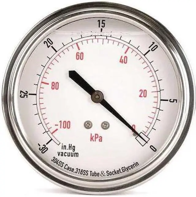 Vacuum Gauge, General Purpose, 3 1/2 in, Basic Gauge Case Material Stainless Steel, Basic Gauge Wetted Parts Stainless Steel, 1/4 in, MNPT, Gauge Connection Location Center Back, -30 to 0, in Hg, Gauge Secondary Range Units kPa, Gauge Secondary Range Values -100 to 0, +/-3-2-3 Percent, Gauge Panel Mountable No, Liquid Filled Yes, Gauge Primary Range Smallest Graduation 1, Gauge Case Material 304 Stainless Steel, Gauge Case Color Stainless Steel, Calibration Certificate Included No. This item has been restricted from sale in the following state (s): []