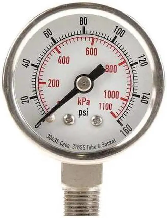 California Proposition 65: This product contains a chemical known to the State of California to cause birth defects or other reproductive harm. Commercial Pressure Gauge, Accuracy +/-3-2-3 Percent, Gauge Case Material 304 Stainless Steel, Nominal Dial Size 1 1/2 in, Lens Material Acrylic, IP/NEMA Rating Not Rated, Hazardous Location Rating Not Rated, Sensor Material 316 Stainless Steel, Socket Material 316 Stainless Steel, Process Connection Type NPT, Process Connection Gender Male, Process Connection Location Bottom, Process Connection Size 1/8 in, Panel-Mountable No, Pressure Gauge Type General Purpose Dial Pressure Gauge. This item has been restricted from sale in the following state (s): []