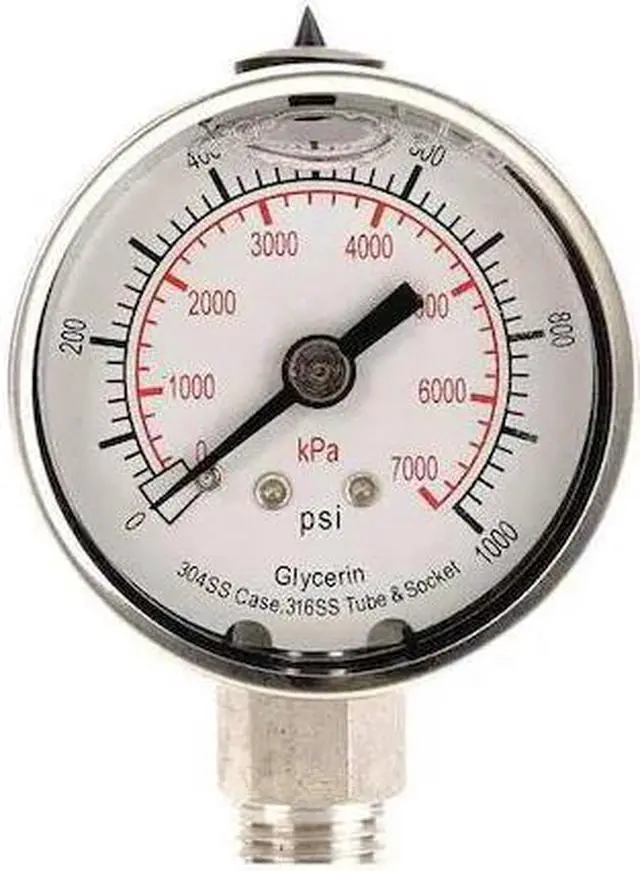 California Proposition 65: This product contains a chemical known to the State of California to cause birth defects or other reproductive harm. Commercial Pressure Gauge, Nominal Dial Size 2 in, Accuracy +/-3-2-3 Percent, Gauge Case Material 304 Stainless Steel, Process Connection Type NPT, Process Connection Gender Male, Lens Material Acrylic, Process Connection Size 1/4 in, Field Fillable No, Process Connection Location Bottom, Case Color Silver, IP/NEMA Rating Not Rated, Primary Pressure Range 0 to 1, 000, Dry Dampening Feature None, Vibration Resistance Liquid-Filled, Dial Color White, Pressure Gauge Type Commercial Pressure Gauge. This item has been restricted from sale in the following state (s): []