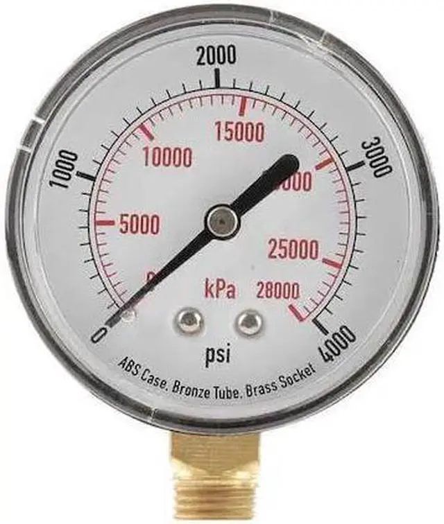 California Proposition 65: This product contains a chemical known to the State of California to cause birth defects or other reproductive harm. Pressure Gauge, Test, 2 1/2 in, Basic Gauge Case Material Plastic, Basic Gauge Wetted Parts Brass / Bronze, 1/4 in, MNPT, Gauge Connection Location Bottom, 0 to 4000, psi, Gauge Secondary Range Units kPa, Gauge Secondary Range Values 0 to 28, 000, +/-3-2-3 Percent, Gauge Panel Mountable No, Liquid Filled No, Gauge Primary Range Smallest Graduation 100, Gauge Case Material ABS Plastic, Gauge Case Color Black, Calibration Certificate Included No. This item has been restricted from sale in the following state (s): []