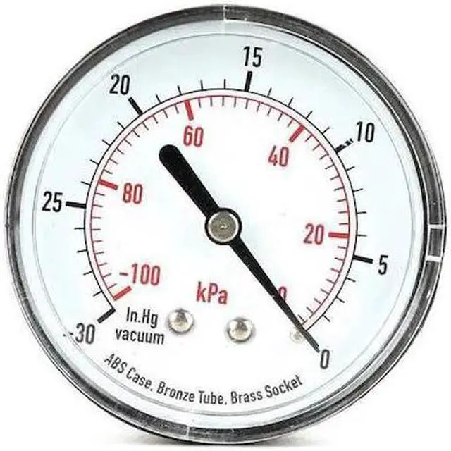 California Proposition 65: This product contains a chemical known to the State of California to cause birth defects or other reproductive harm. Commercial Vacuum Gauge, Accuracy +/-3-2-3 Percent, Gauge Case Material ABS Plastic, Nominal Dial Size 2 1/2 in, Lens Material Acrylic, IP/NEMA Rating Not Rated, Hazardous Location Rating Not Rated, Sensor Material Bronze, Socket Material Brass, Process Connection Type NPT, Process Connection Gender Male, Process Connection Location Center Back, Process Connection Size 1/4 in, Panel-Mountable No, Pressure Gauge Type General Purpose Dial Pressure Gauge. This item has been restricted from sale in the following state (s): []
