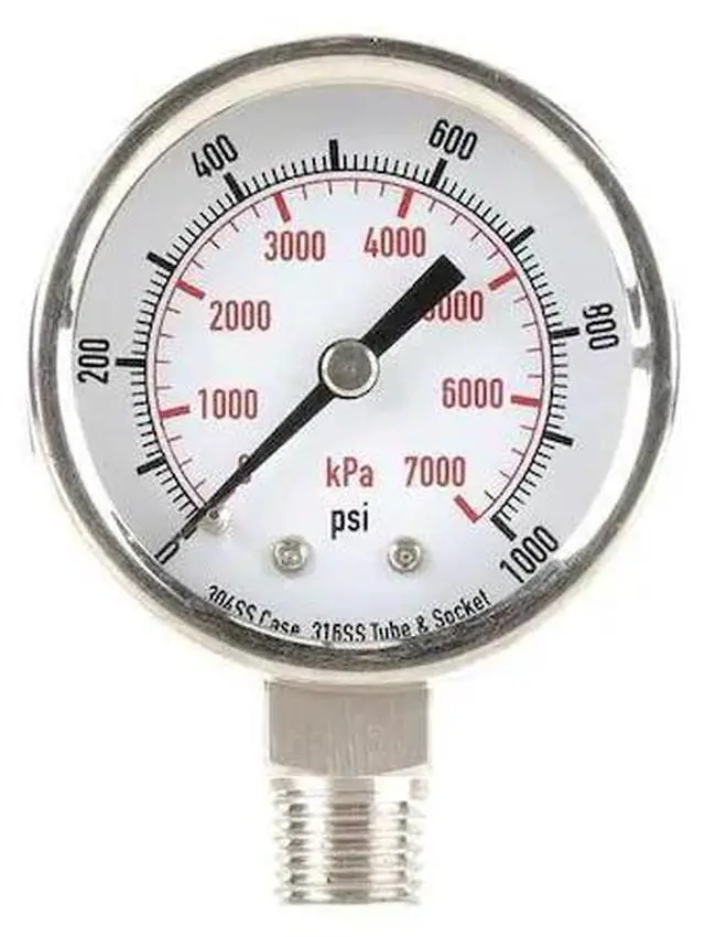 California Proposition 65: This product contains a chemical known to the State of California to cause birth defects or other reproductive harm. Commercial Pressure Gauge, Nominal Dial Size 2 in, Accuracy +/-3-2-3 Percent, Gauge Case Material 304 Stainless Steel, Process Connection Type NPT, Process Connection Gender Male, Lens Material Acrylic, Process Connection Size 1/4 in, Field Fillable No, Process Connection Location Bottom, Case Color Silver, IP/NEMA Rating Not Rated, Primary Pressure Range 0 to 1, 000, Dry Dampening Feature None, Vibration Resistance None, Dial Color White, Pressure Gauge Type Commercial Pressure Gauge. This item has been restricted from sale in the following state (s): []