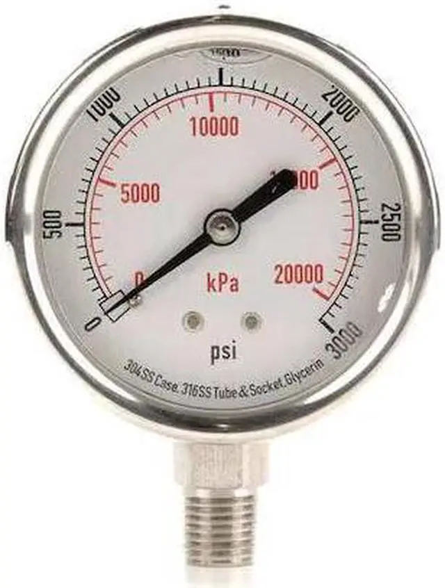 California Proposition 65: This product contains a chemical known to the State of California to cause birth defects or other reproductive harm. Commercial Pressure Gauge, Nominal Dial Size 2 1/2 in, Accuracy +/-3-2-3 Percent, Gauge Case Material 304 Stainless Steel, Process Connection Type NPT, Process Connection Gender Male, Lens Material Acrylic, Process Connection Size 1/4 in, Field Fillable No, Process Connection Location Bottom, Case Color Silver, IP/NEMA Rating Not Rated, Primary Pressure Range 0 to 3, 000, Dry Dampening Feature None, Vibration Resistance Liquid-Filled, Dial Color White. This item has been restricted from sale in the following state (s): []