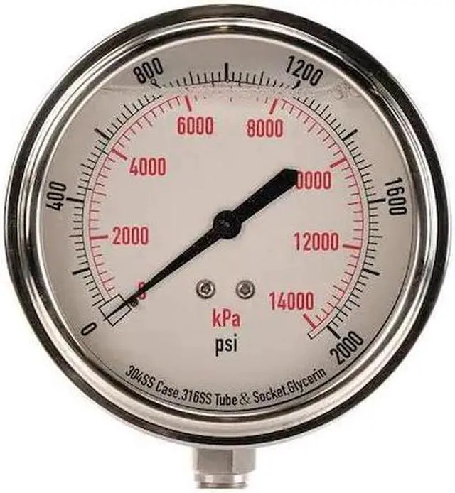 California Proposition 65: This product contains a chemical known to the State of California to cause birth defects or other reproductive harm. Commercial Pressure Gauge, Nominal Dial Size 3 1/2 in, Accuracy +/-3-2-3 Percent, Gauge Case Material 304 Stainless Steel, Process Connection Type NPT, Process Connection Gender Male, Lens Material Acrylic, Process Connection Size 1/4 in, Field Fillable No, Process Connection Location Bottom, Case Color Silver, IP/NEMA Rating Not Rated, Primary Pressure Range 0 to 2, 000, Dry Dampening Feature None, Vibration Resistance Liquid-Filled, Dial Color White. This item has been restricted from sale in the following state (s): []