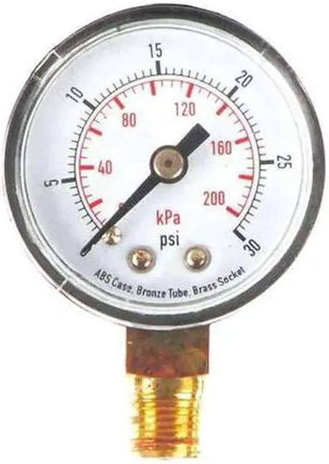 California Proposition 65: This product contains a chemical known to the State of California to cause birth defects or other reproductive harm. Commercial Pressure Gauge, Nominal Dial Size 1 1/2 in, Accuracy +/-3-2-3 Percent, Gauge Case Material ABS Plastic, Process Connection Type NPT, Process Connection Gender Male, Lens Material Acrylic, Process Connection Size 1/8 in, Field Fillable No, Process Connection Location Bottom, Case Color Black, IP/NEMA Rating Not Rated, Primary Pressure Range 0 to 30, Dry Dampening Feature None, Vibration Resistance None, Dial Color White, Pressure Gauge Type Commercial Pressure Gauge. This item has been restricted from sale in the following state (s): []