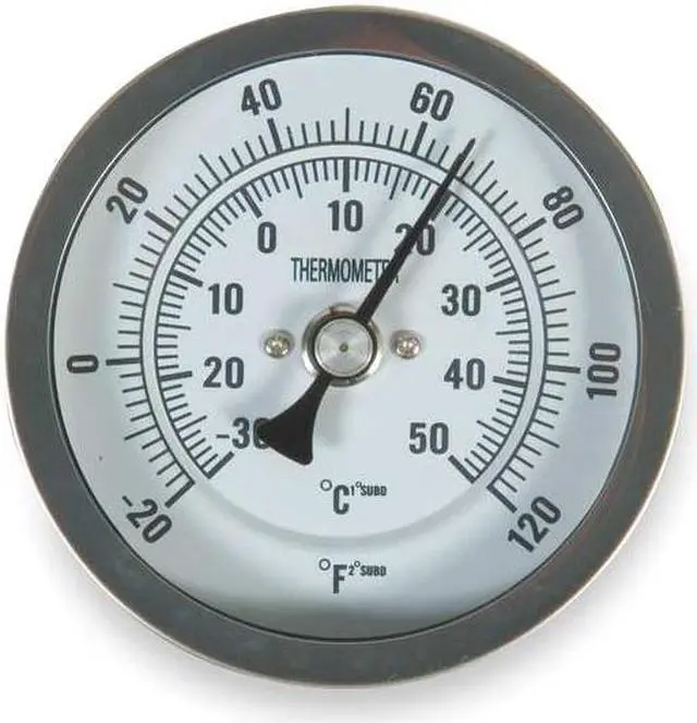 Dial Thermometer, -20 Degrees to 120 Degrees F/-30 Degrees to 50 Degrees C, Stem Length 9 in, 1/2 in NPT, Back, Includes NIST-Traceable Certificate No, 304 Stainless Steel Housing and Stem with Glass Lens, Dial, Industrial Dial Thermometer. This item has been restricted from sale in the following state (s): []
